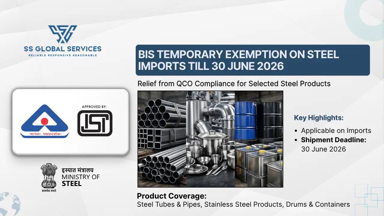 During this period, BIS certification requirements for specified steel products are temporarily not mandatory, allowing importers and stakeholders to import goods without compliance under QCO.